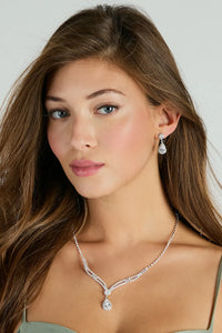 Glam Shine Teardrop Cubic Zirconia Necklace And Earrings Set Glam Shine Teardrop Cubic Zirconia Necklace And Earrings SetGive off a gorgeously glam shine with this cubic zirconia necklace and earrings set. It features a V-shaped collar necklace with a single row of cubic zirconia stones leading to a two-row curved stone design, accented with a center round stone and a hanging teardrop stone, both outlined with mini cubic zirconia stones for all the more sparkle. The short drop earrings feature a matching round and teardrop cubic zirconia design. Style this luxe set with a cocktail dress and stiletto heels. Fit & Features - Necklace and earrings set