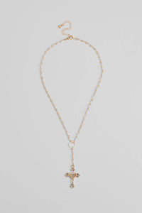 Pretty Sparkle Rhinestone Cross Pearl Lariat Necklace Pretty Sparkle Rhinestone Cross Pearl Lariat NecklaceRadiate the prettiest sparkle with this dainty rhinestone cross pearl lariat necklace. It features a faux pearl beaded chain, a small O-ring center, and a short lariat with a hanging cross and heart pendant accented with mini rhinestones. Style with rhinestone stud earrings. Fit & Features - Faux pearl beaded chain-link design