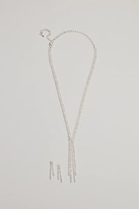 Glitzy Rhinestone Lariat Necklace And Earring Set Glitzy Rhinestone Lariat Necklace And Earring SetGlitz up your formal looks with this luxe jewelry set featuring a rhinestone collar necklace with a lariat design and matching rhinestone duster earrings. Perfect for pairing with a satin formal dress and heels. Fit & Features - Necklace and earrings set
