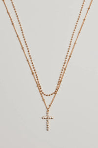 Joyful Glam Layered Rhinestone Cross Necklace Joyful Glam Layered Rhinestone Cross NecklaceTis the season for joy with this glam layered cross necklace designed with dainty beading and glam rhinestone embellishments. Complete the look in a long sleeve top and midi skirt. Fit & Features - Layered necklace