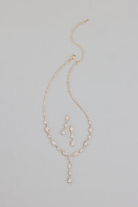 This elegant necklace and earrings set features sparkling rhinestones that capture and reflect light with brilliance while adding the perfect complement to your formal dress.