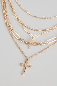 Stacked and stunning—this layered chain necklace mixes bold links with delicate strands and a cross pendant for that effortlessly edgy-meets-chic vibe. Perfect for elevating casual fits or adding a statement to night-out looks.