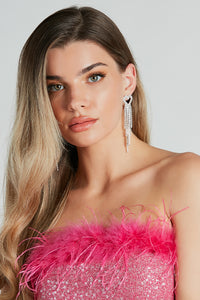 Showcase your love for stunning sparkle with these rhinestone heart fringe earrings! They feature an adorable heart-shaped outline post embellished with mini rhinestones and a rhinestone fringe cascading design. Style these statement earrings with a sequin mini dress and platform heels for the perf party look!