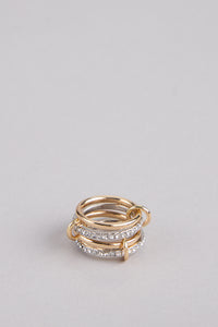 One piece, endless vibes—this connected ring design mixes gold, silver, and rhinestone bands for that effortlessly stacked look without the extra effort. Bold, chic, and ready to shine.