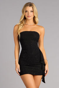 Designed for nights that call for confidence with a touch of flirt, this glitter knit mini balances clean lines with a softly dramatic side ruffle. The strapless silhouette keeps it polished while the subtle shimmer ensures every entrance feels intentional.