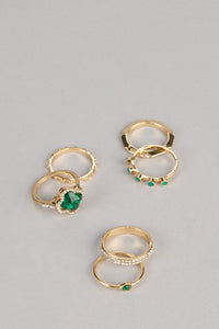 Stacked, sparkling, and seriously chic. This gold ring set mixes emerald-inspired stones with rhinestone accents—made for layering or wearing solo when you’re feeling a little extra.