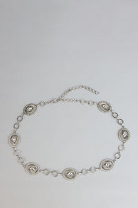 Add a touch of Western glam with this rhinestone concho chain belt. Featuring silver-tone medallions and crystal embellishments, it’s the perfect accent to cinch your waist and elevate denim, skirts, or dresses with vintage-inspired shine.