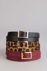 From polished to playful, this trio belt set brings instant edge to any look with bold faux leather finishes, a touch of leopard print, and sleek gold square buckles.