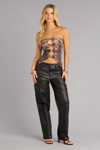 Meet the cargos that take “cool-girl energy” and dial it all the way up. Finished in a sleek coated sheen, these straight-leg cargo pants blend street attitude with going-out polish—pair them with heels for nighttime glam or sneakers for off-duty confidence.