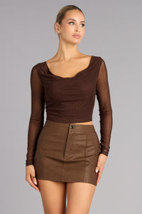 This rhinestone mesh top brings drama in a soft, wearable way — a double cowl neckline in the front and back, sheer sleeves, and a tie detail that makes the fit feel intentionally flirty. It’s the easiest upgrade to your night-out rotation.