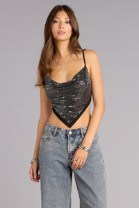 This rhinestone cowl top is pure going-out energy — drapey in the front, strappy in the back, and edged with that pointed hanky hem that gives your waist the spotlight. It’s sleek, sparkly, and designed to look good under club lights and on camera.