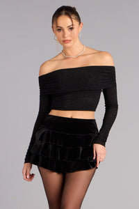 This off-shoulder sparkle top brings soft drama — a foldover neckline, rhinestone detailing, and sleek long sleeves that keep the look polished.