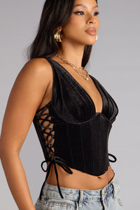 Soft velvet meets sultry details. This plunge corset crop top is finished with lace-up sides for that perfect mix of luxe and daring—your new go-to for nights that call for drama. Pair with denim and heels for a sultry look.
