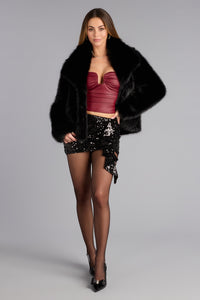 All sparkle, no chill. This faux fur sequin mini skirt mixes cozy and glam with a textured finish and curve-hugging fit made for nights when you want to shine a little brighter.