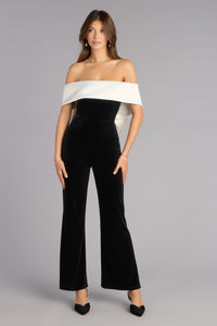The kind of piece that walks in polished before you even say a word. This off-the-shoulder velvet jumpsuit flexes a dramatic satin bow-back design, setting a chic and luxe vibe.