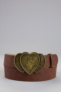 Add a little country charm to your look. This faux leather belt features an engraved triple-heart buckle with antique gold detailing—perfect for adding western flair to denim, dresses, and fall outfits that call for a statement.