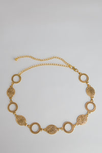 Bring a regal touch to your look with this medallion chain belt. Designed with textured concho accents and open circle details, it adds instant polish and vintage-inspired glamour.