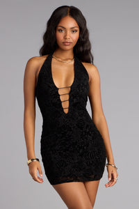 All eyes on you—exactly where they should be. This flocked mesh halter mini brings high drama with a plunging neckline, front strap cutouts, and a body-hugging fit that sculpts every curve. It’s equal parts mysterious and magnetic—the perfect dress for your next night out with the girls!