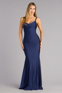 The Renata stuns with intricate lace appliqué and a sleek, body-skimming silhouette. The deep V-neckline and delicate straps frame the front beautifully, while the open tie-back adds a dramatic reveal. Finished in a fluid mermaid skirt, this gown brings quiet luxury to every entrance.