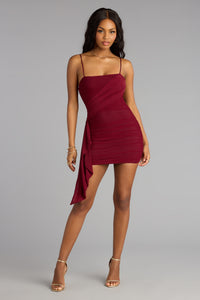 When smooth meets sultry. This ruched mini dress wraps your curves just right with a draped side sash made to steal the scene. Perfect for date nights and dressy plans that deserve a little extra.