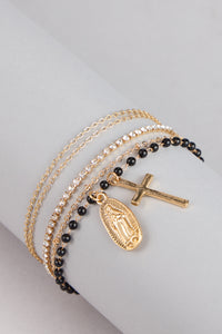 Stacked and styled for instant impact—this three-pack bracelet set brings together layered chains, a cross, and pendant charms for that perfectly undone vibe. Wear them solo or pile them on for maximum shine.