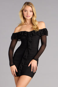 Romantic, ruched, and ready to steal the spotlight. This off-shoulder mesh mini hugs your shape with long sleeves, ruffle trim, and a bodycon fit that feels equal parts flirty and confident.
