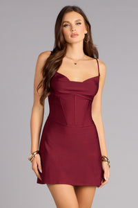 This cowl-neck mini brings that soft-sophisticated vibe — with slim straps, a subtly sculpted bust, and corset-inspired boning that shapes without feeling too serious. The A-line finish keeps it flirty, flattering, and easy to wear in any setting.