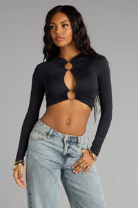 Low effort, high impact. This long sleeve crop top brings instant heat with its double-hoop cutout front and curve-hugging fit. Style it with jeans for that perfect balance of cool, confident, and just a little dangerous.