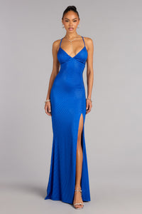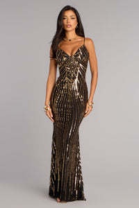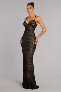 Designed for entrances that linger, the Cassie sequin pattern gown catches the light with every step and every turn. The mermaid floor length silhouette is finished with a low back cut that feels polished, confident, and undeniably event-ready.