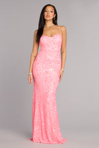 A romantic silhouette with a subtle shimmer, the Lacey floral sequin knit gown moves with soft drama and refined allure. Designed with a sweetheart neckline, lace-up open back, and a high front slit, it balances elegance with just the right hint of intrigue.