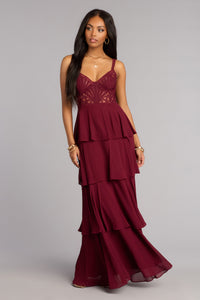 - Tiered ruffled A-line silhouette