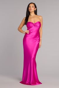 Sleek and sculpted with an effortlessly glamorous feel, the Liza gown is made for evenings that call for confident elegance. Lustrous satin defines the mermaid floor-length silhouette, while the sweetheart halter neckline and high slit create a striking, polished finish.
