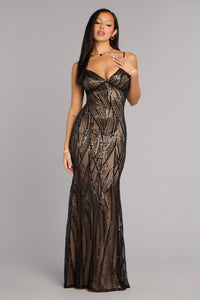 For evenings that shimmer long after the lights dim, the Mae sequin pattern gown delivers sleek, sculpted glamour. Designed in a mermaid floor-length silhouette with delicate straps and a striking strappy open back, it hugs in all the right places before flowing into a dramatic finish made for unforgettable arrivals.