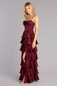 Romantic with a little drama in every step, this satin tiered A-line gown was made for twirling under chandeliers. The softly draped sweetheart neckline, corset-inspired bodice, and lace-up back shape the waist, while cascading tiers and a front slit create movement that feels straight off the best dressed list.