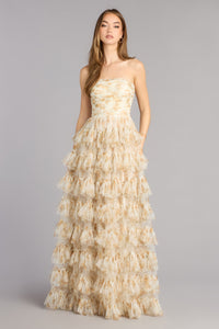 Romantic and effortlessly polished, the Madisyn gown is made for moments that feel straight out of a dream sequence. Designed in floral mesh with a softly pleated bodice and a tiered, ruffled a-line floor length hem, it brings graceful movement and timeless charm to every entrance.