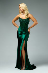 For the kind of entrance that quiets the room mid-conversation, the Karissa gown is all shimmer and sculpted drama. Designed with glitter tulle sequins, a structured corset bodice, a lace-up back, and a high front slit, this mermaid dress feels polished and unforgettable.