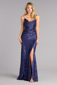 The Breanna formal dress brings sleek seduction to every spotlight moment. Crafted from faux leather-lined fabric with a sculpted corset bodice, halter sweetheart neckline, and high front slit, it’s the definition of modern bombshell energy—made to turn heads from dinner to afterparty.