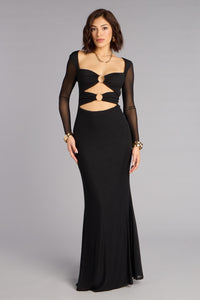 The Celeste formal gown is made to mesmerize—crafted in sleek mesh with daring cutouts and gleaming hardware accents that sculpt the waist. With its deep neckline, open back, and floor-length mermaid silhouette, it brings just the right mix of sultry and sophisticated for your most glamorous nights out.