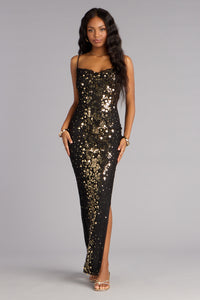 The Brookelle formal dress was made for the spotlight—sleek, luminous, and endlessly glamorous. Draped in shimmering sequins over mesh, it features a soft cowl neckline, delicate straps, and a daring side slit that moves with liquid shine. Every step feels like a grand entrance.