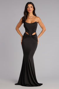 Designed to command attention, the Gina formal gown blends sleek satin with sculpted detailing for a look that defines modern allure. The strapless scoop neckline and corset bodice accentuate every curve, while ruched cutouts and a floor-length mermaid silhouette bring pure red-carpet energy to any event.