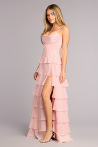 Light, romantic, and made to move, the Harmony chiffon gown feels like a breath of fresh air at every turn. A sweetheart pleated neckline with delicate applique trim flows into a ruffled a line silhouette, finished with a high front slit and lace-up back for an effortlessly polished impression.