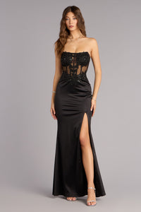Sleek and sculptural, the Cora satin gown is made for evenings that call for polished drama. A mesh applique corset bodice shapes the waist before flowing into a mermaid silhouette with a high slit that adds movement and allure.