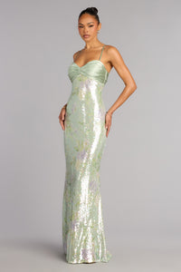 Designed for moments that call for quiet glamour, the Aimee sequin mermaid gown catches the light with every step and every turn. A sculpted bodice with starfish hardware and a cutout back brings a polished yet unexpected finish.