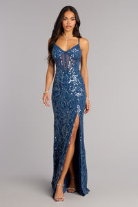 Made for evenings that call for confident elegance, the Brenna sequin mermaid gown blends sculpted structure with fluid movement. A sheer corset-plunge bodice with sequin appliqué, lace-up back, and a high front slit delivers a striking balance of drama and refinement.