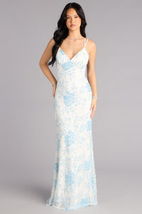 Elegant and softly dramatic, the Manisha sequin mermaid gown is designed to leave a lasting impression from every angle. A floral garden pattern and sculpted cutout back bring romance and refinement together for moments that call for polished confidence.