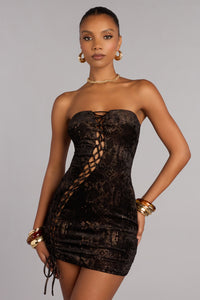 So glam-coded, this snake print mini dress knows exactly when to steal the focus. The sleek tube fit hugs just right, with a bold lattice cutout that turns a simple night out into a statement plan.