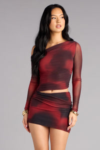Hot from every angle. This abstract mesh mini dress features an asymmetrical neckline, ruched sides, and a curve-hugging fit that brings the drama. Sheer sleeves and smoky tones make it perfect for nights that start with dinner and end at sunrise.