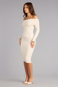 Simple, sleek, and seriously flattering. This foldover off-the-shoulder midi dress hugs every curve with a soft stretch fit—perfect for dinner plans, date nights, or any moment that calls for subtle confidence.