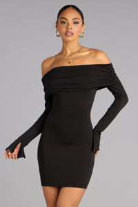 This long sleeve off-the-shoulder mini dress hugs in all the right places for that effortless “oh, this old thing?” vibe. Perfect for brunch, dinner dates, or any casual night out plans.