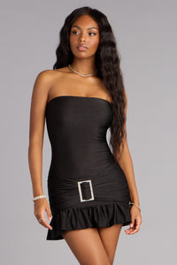 Bold, sleek, and built for the spotlight. This strapless mini hugs your shape with a ruched fit and a flirty ruffle hem, finished with a rhinestone belt detail that gives it that extra “wow.” Perfect for when your outfit is the main event.